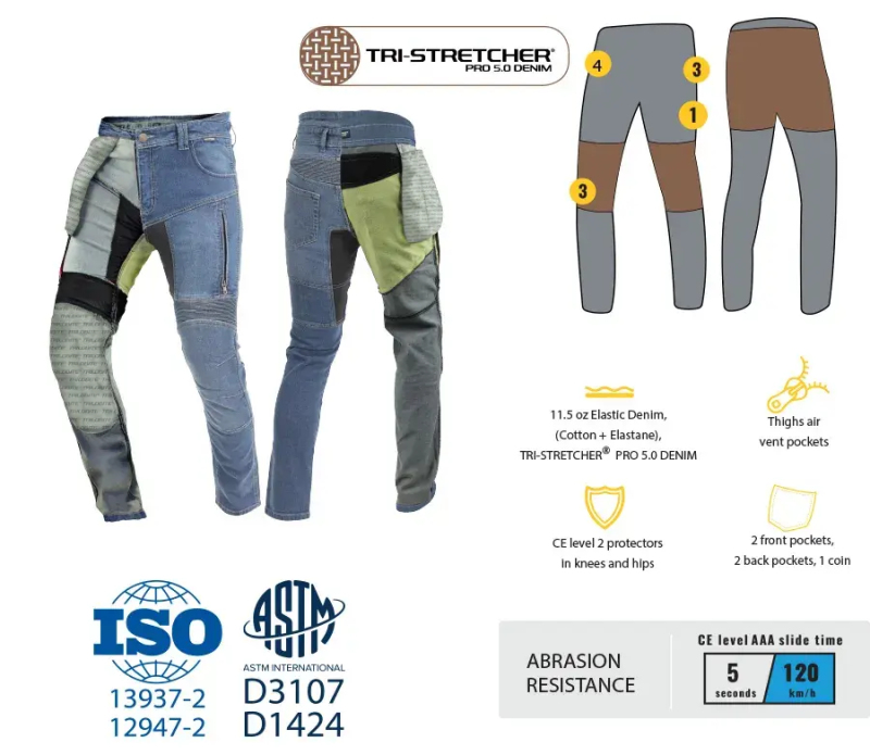 Nová generace syntetických a polyethylenových vláken umožňuje smíchat Polyester, Nylon, Elastan a další příze, například i přírodní, do zcela nové, sofistikované tkaniny pro výrobu motocyklových džínů Trilobite. Tri-Stretcher® PRO 5.0 Denim je moderní technická tkanina, která je budoucností jízdy na motocyklu. Vyrábí se ze směsi materiálů z rodiny polyamidů jako je Nylon a aromatických polyamidů, jako je Aramid nebo polyuretanová vlákna vyrobená z Elastanu, a zároveň zahrnuje přírodní bavlněnou tkaninu. Tato látka je jedinečná svou úžasnou pevností a zároveň nízkou hmotností. Tri-Stretcher® PRO 5.0 Denim je jeden „chytrý tým“ různých vláken spletených dohromady, které vás v případě nehody ochrání stejným způsobem jako celokožená kombinéza, ale bez kompromisu na pohodlí.
