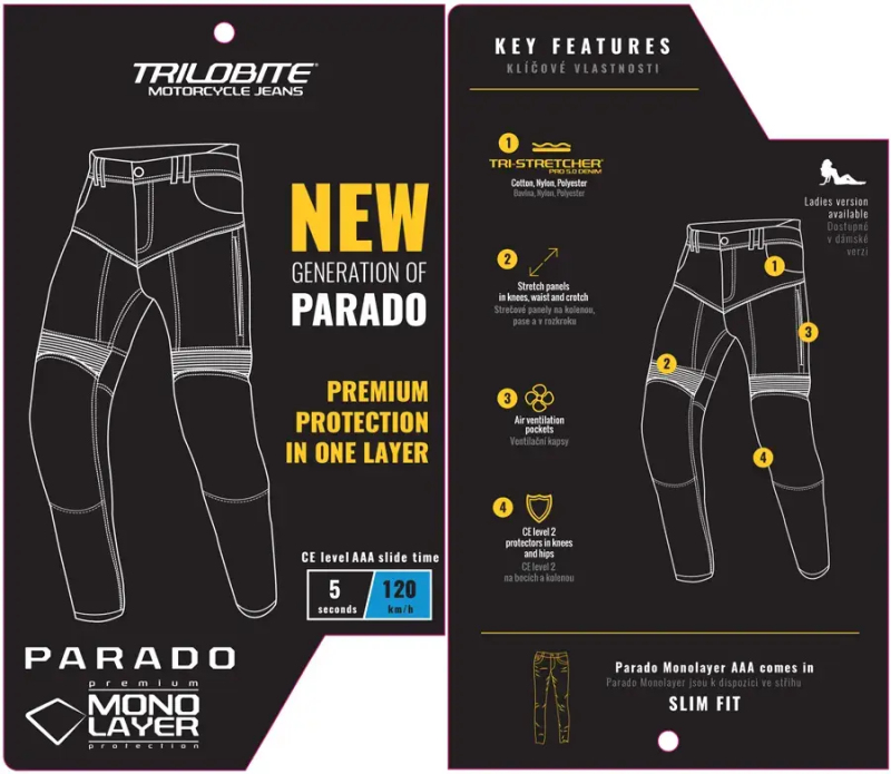 Ikona značky TRILOBITE® motorcycle jeans, klasické a všemi oblíbené džíny Parado mají nový přírůstek do rodiny. Nové, revoluční, motocyklové džíny Parado Monolayer certifikované na level AAA, poskytují ideální kombinaci pohodlí a ochrany. Jsou lehké, prodyšné a mají velké ventilační kapsy. Díky tomu se hodí na projížďky v teplých letních dnech. Nenajdete na nich samostatnou aramidovou vrstvu, jako u jejich dvouvrstvých kolegů. V tomto případě je aramid spolu s jinýmy syntetickými polymernímy vlákny přímo součástí úpletu. Tato technologická novinka TRI-STRETCHER® 5.0 džínového vzhledu má jedinečný design a konstrukci vyvinutou v dílně TRILOBITE®. Zaručí vám největší dostupnou úrověň pohodlí a bezpečnosti.