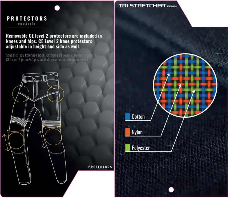 TRI-STRETCHER® PRO 5.0 Denim je směs syntetických polymerních vláken na bázi nylonu a aromatických polyamidů (aramid) s džínovým vzhledem. Tato látka jedinečná svou úžasnou pevností a zároveň nízkou hmotností. Tri-Stretcher® PRO 5.0 Denim je chytrý „tým“ různých vláken spletených dohromady, který vás v případě nehody ochrání se stejným výkonem jako kožená kombinéza, ale bez ztráty pohodlí. Jedná se o moderní tkaninu, která je budoucností jízdy na motorce.