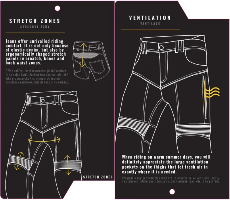 Díky nově vyvinuté látce TRI-STRETCHER® 5.0, který v jedné vrstvě nabízí dosud nejvyšší možnou ochranu pro případ pádu a oděruvzdornosti si můžete užít zážitek z jízdy na motorce bez kompromisu. Ještě donedávna bylo možné dosáhnout nejvyššího stupně AAA certifikace pouze u kožených kombinéz, které jsou pro městskou jízdu značně nepohodlné. Dnes je to ale jinak. Ukážeme vám, že to jde lépe. Lehké, prodyšné a skvěle padnoucí džíny Parado vás ohromí již při první jízdě. Jakmile vyzkoušíte, už nebudete chtít jinak.