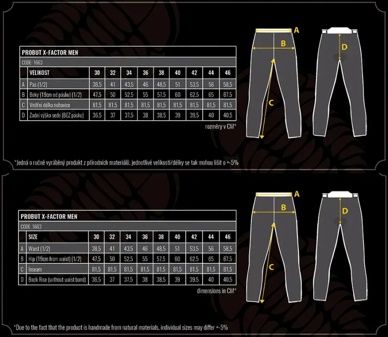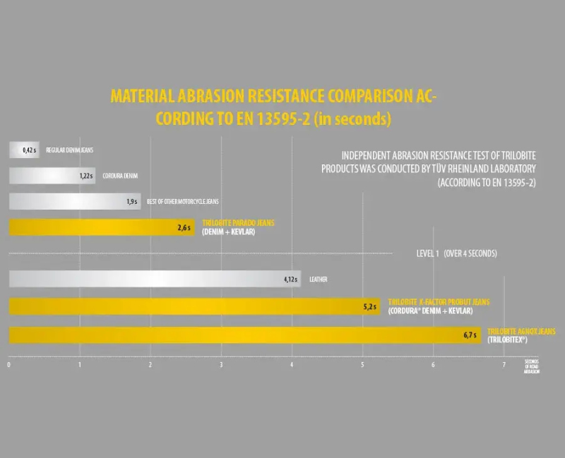 Džíny Probut X-Factor jsou vyrobeny z 12,5 oz Cordura® denimu s Coolmax® vlákny, který je odolný proti oděru. Materiál Cordura® denim je čtyřikrát pevnější než standardní denim se stejnou gramáží. Impaktní zóny na kolenech, bocích a zadní straně stehen jsou navíc podšity velkými panely z aramidových vláken vyrobených z materiálu Kevlar® od společnosti DuPont ™. Celkově to znamená dvojitou odolnost proti oděru.