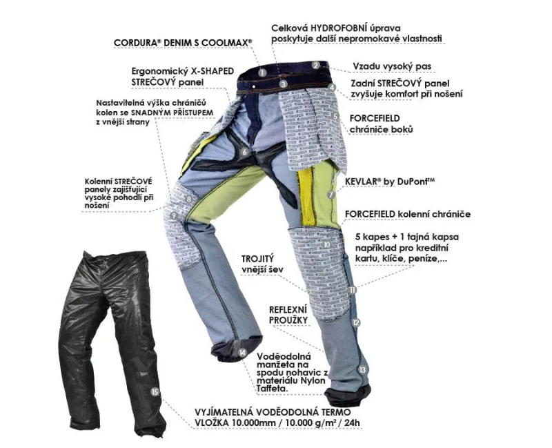 - Vnější materiál: Cordura® denim s gramáží 12,5 oz a systémem funkčních vláken Coolmax®