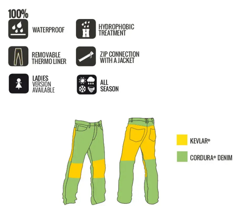 - podšívka: Aramidová vlákna v oblasti kolen, boků a zadní strany stehen z materiálu Kevlar® vyrobeného progresivní technologií DuPont ™