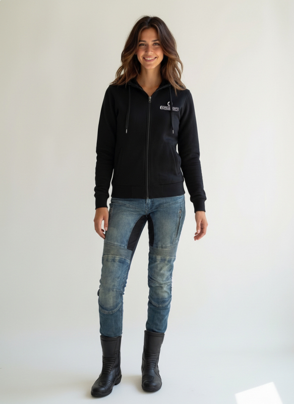 Kapuce je odnímatelná pomocí zipu, což ocení jezdkyně, které preferují čistý vzhled nebo chtějí mikinu nosit pod další vrstvou oblečení. Pro uložení osobních věcí jsou k dispozici dvě vnější kapsy na zip a dvě vnitřní náprsní kapsy vhodné pro mobilní telefon a peněženku. V chladnějším počasí lze mikinu kombinovat se softshellovou nebo koženou bundou bez chráničů.