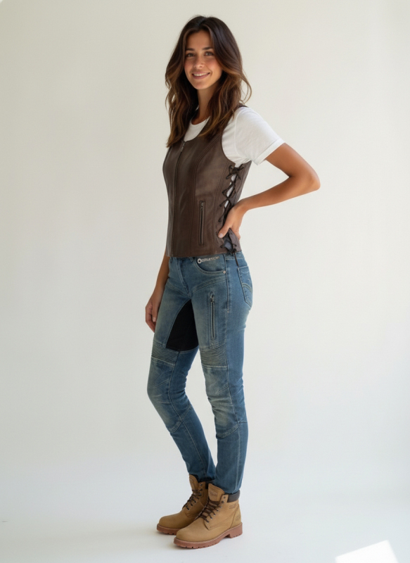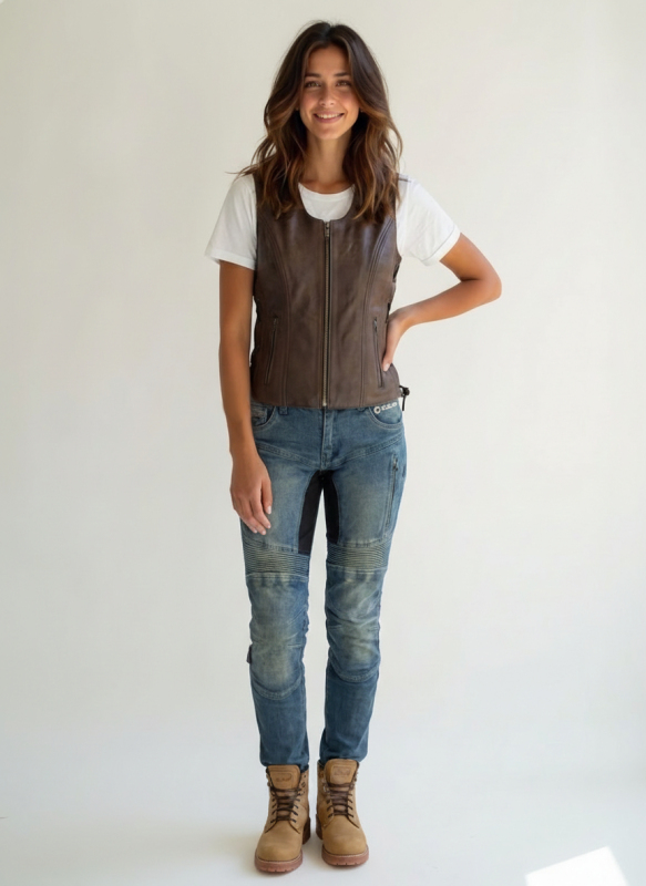 Atraktivní dámská kožená vesta Cruison Lady Virginia v hnědé barvě se stylovým bočním šněrováním šitá z velmi kvalitní jemné kůže. Na přední straně jsou dvě klasické kapsy se zapínáním na zip.