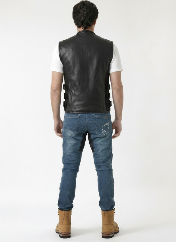Kožená vesta Cruison SWAT v moderním motorkářském stylu, vyrobená z hladké prémiové hovězí kůže s důrazem na kvalitu materiálu a zpracování. Přední část vesty je vybavena dvěma kapsami na zip a praktickým zapínáním pomocí kvalitního YKK zipu.